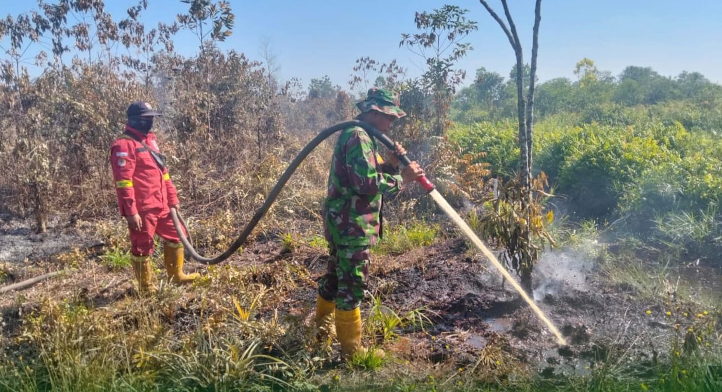 Tambang, – Topikutama. Com | Anggota Koramil 07/Kampar jajaran Kodim 0313/KPR Serma Ayu Wisafrizal dan Serda Jemmi bersama Manggala Agni, dan BPBD terus melaksanakan tugasnya dalam memadamkan api serta pendinginan lahan.Sabtu (01/11/2025).
