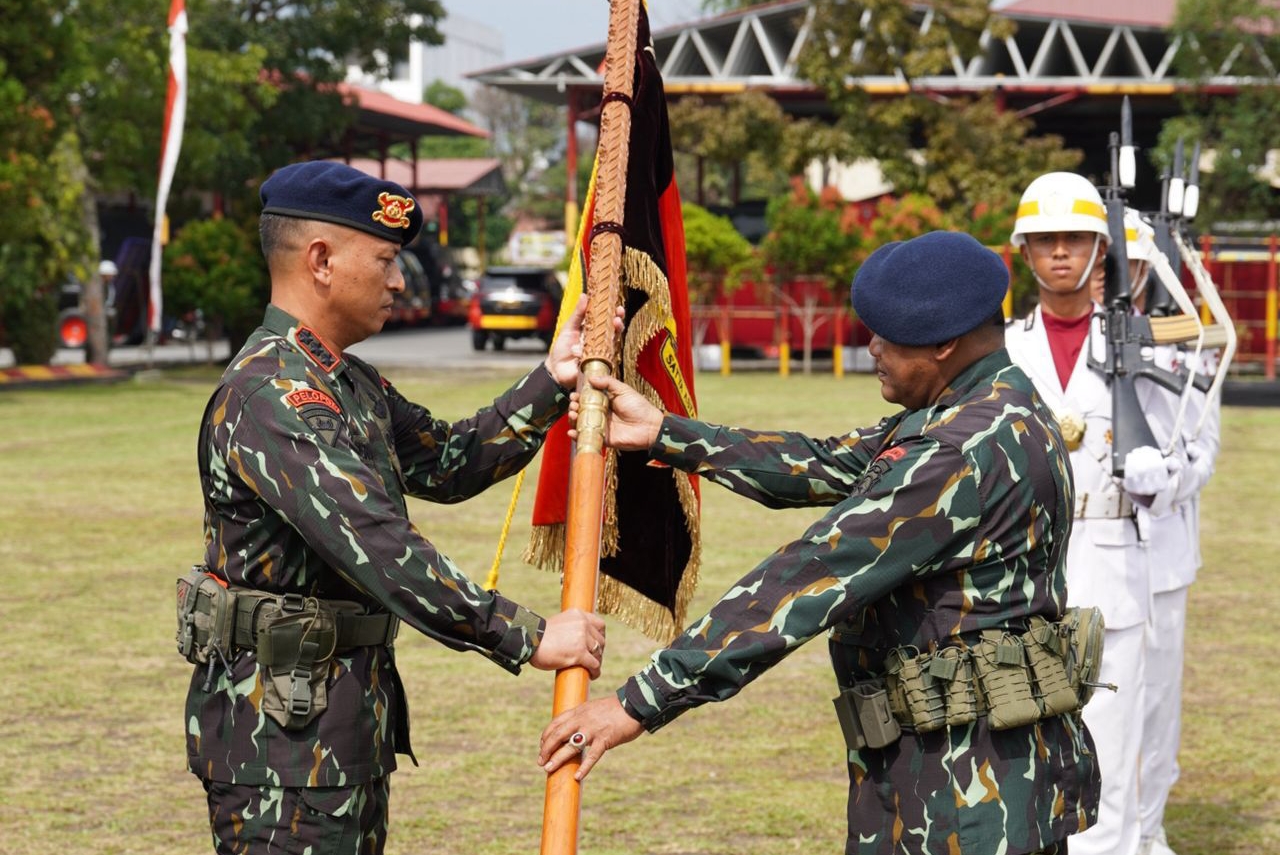 Pekanbaru – Allnewsterkini. Com | Tradisi pedang pora mewarnai Farawell and Welcome Parade Komandan Satuan Brimob Polda Riau di Mako Satuan Brimob Polda Riau yang di warnai dengan pasukan berbaju loreng Korps Brimob Polri.
